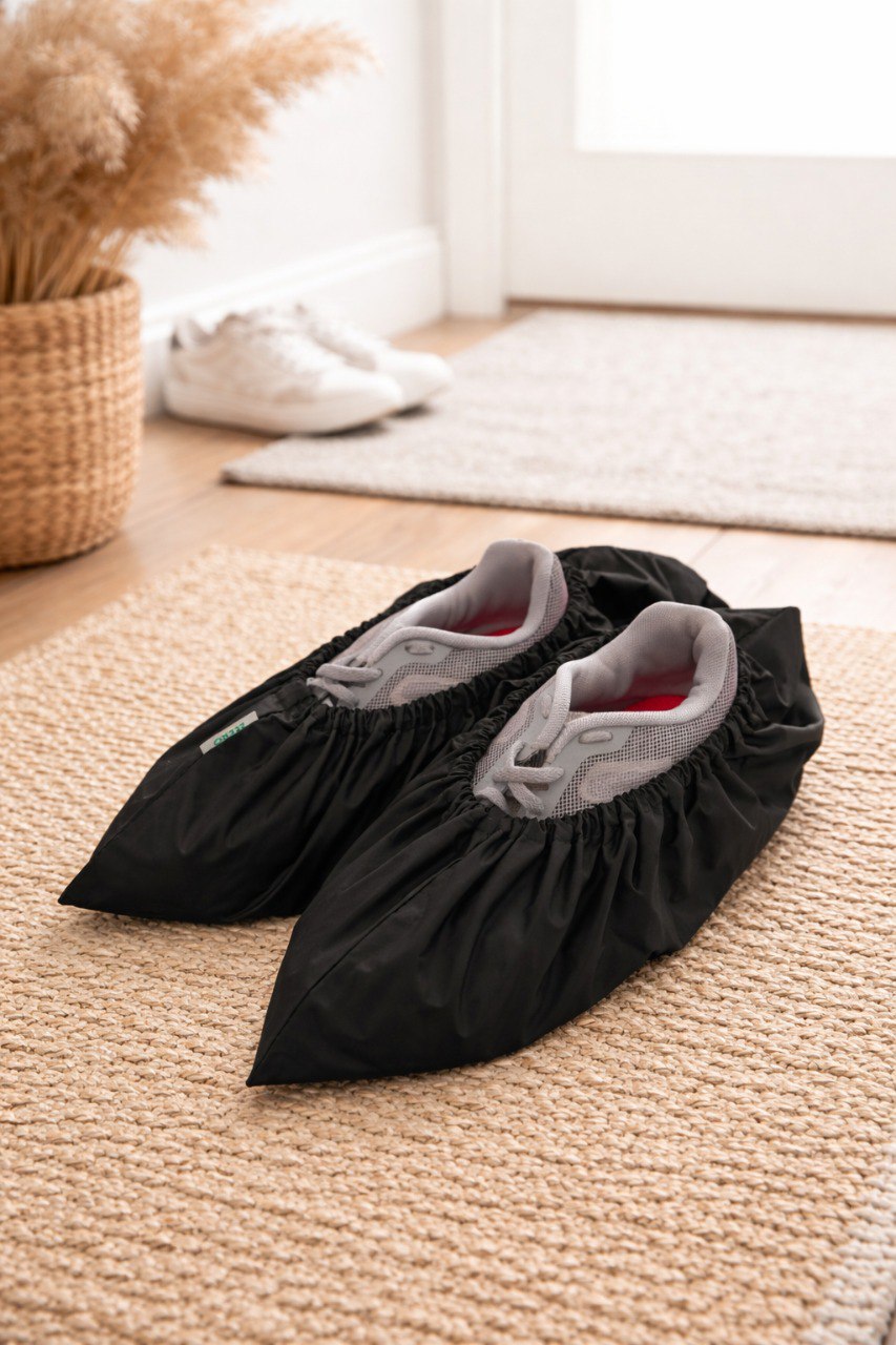 Многоразовые бахилы из водоотталкивающей ткани с удобным мешочком для хранения и переноски. Подходит для обуви от 34 до 45 размера.