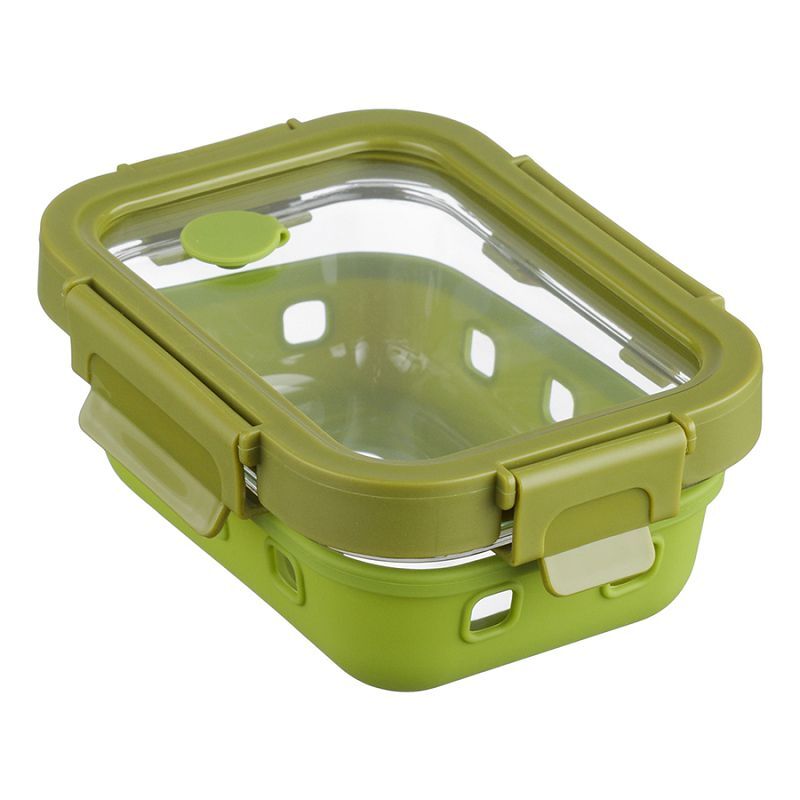 Контейнер стеклянный в чехле из силикона отлично подходит для хранения, запекания и транспортировки продуктов, в том числе готовых блюд. Емкость из боросиликатного стекла не впитывает запахи и загрязнения, легко моется. Крышка с надежными пластиковыми замками на каждой стороне обеспечивает плотное закрывание. Материалы не содержат бисфенол-А и являются абсолютно безопасными для здоровья. Наличие специального вентиляционного отверстия позволяет выпустить лишний воздух или горячий пар, что повышает герметичность и улучшает условия хранения продуктов. Силиконовый чехол без труда снимается для более тщательной очистки контейнера.